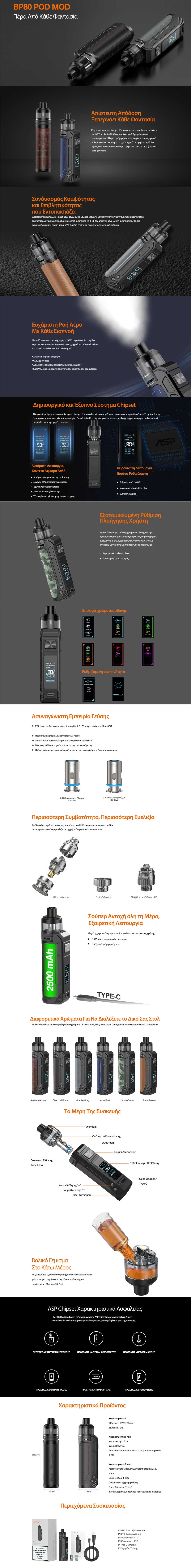 Το ηλεκτρονικό τσιγάρο Aspire BP80 starter kit έχει σχεδιαστεί για να ξεχωρίσει και λειτουργικά αλλά και γευστικά. H ρύθμιση του αέρα όπως και οι αντιστάσεις του που είναι υψηλής ποιότητας, εγγυώνται την πλούσια απόδοσης γεύσης και απόλαυσης. Συνδυάζεται αρμονικά από μεταλλικό κράμα ψευδαργύρου με το μαλακό δέρμα της λαβής, δημιουργώντας έτσι μία ιδιαίτερα συμπαγή σχέση με την συσκευή με ιδιαίτερη ρετρό αισθητική.