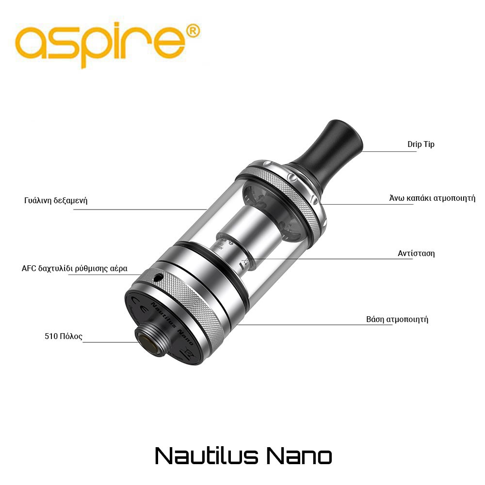 Η Aspire συνδύασε τα χαρακτηριστικά του Nautilus 3 με την κομψότητα του εμβληματικού Nautilus Mini και δημιούργησε τον Nautilus Nano, ενός ατμοποιητή εξειδικευμένου στην σφικτή – Mouth to Lung – εισπνοή, συμβατό με κάθε συσκευή Mod! Ο Nautilus Nano φέρει όλες τις λειτουργικές ανέσεις που απαιτούμε από τους clearomizers μας σε προσιτή τιμή και γνώριμα χαρακτηριστικά για παλιούς και νέους ατμιστές! Κυκλοφορεί στην διάμετρο των 19mm και σε παραδοσιακή τριπλέτα χρωμάτων (Μαύρο, Ασημί, Gunmetal) που εναρμονίζεται οπτικά και αισθητικά στην πλειοψηφία των μπαταριών και Mods!