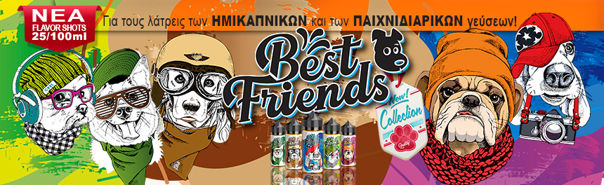 Best Friends υγρά shake and vape. Μια σειρά αρωμάτων αφιερωμένη στους καλύτερους φίλους του ανθρώπου, τα λατρεμένα μας κατοικίδια! Πλασμένα με την ίδια αγάπη με την οποία αγκαλιάζουμε τα σκυλάκια και τα γατάκια, τα Best Friends υπόσχονται να μας συντροφεύουν όλη την ημέρα με την ίδια γνώριμη θαλπωρή!