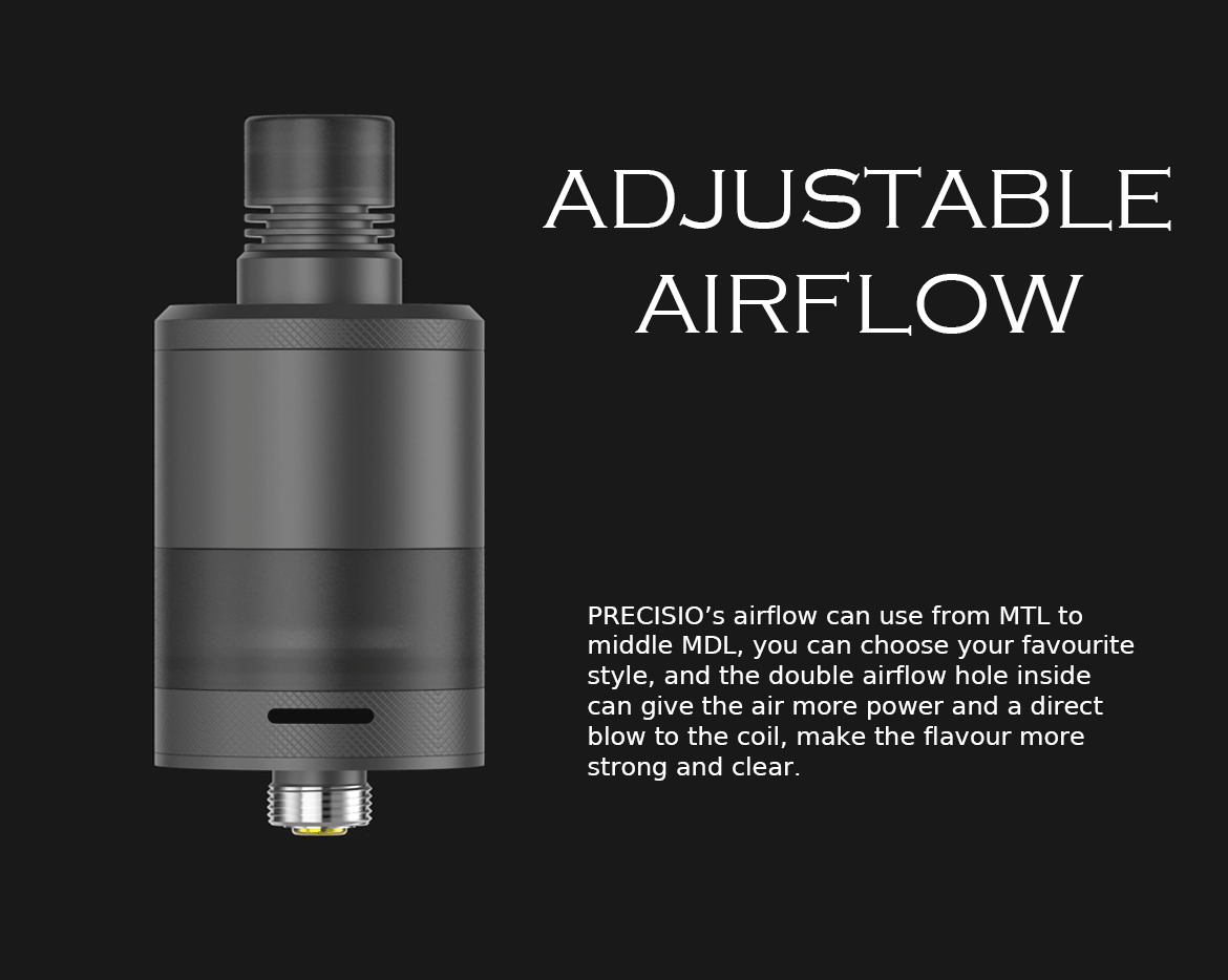 Ονομάστηκε έτσι γιατί υπάρχει λόγος. Ο ατμοποιητής Precisio MTL είναι εξαιρετικά ακριβής με την ρύθμιση ροής αέρα. Από την μια πλευρά του δακτυλίου διαθέτει πέντε μικρές οπές αλλά συνεχίζοντας το δαχτυλίδι ανακαλύπτουμε μια μεγαλύτερη οπή για ακόμα μεγαλύτερη ροή αέρα.