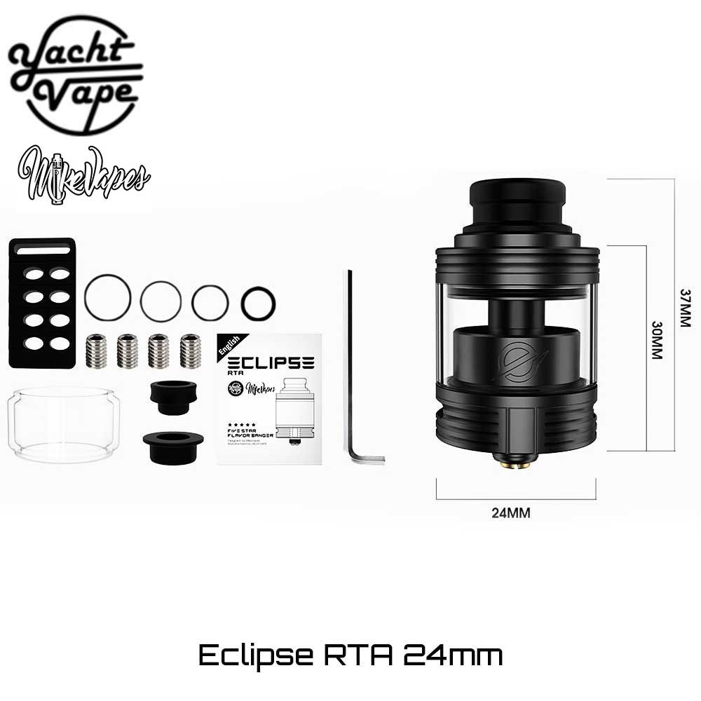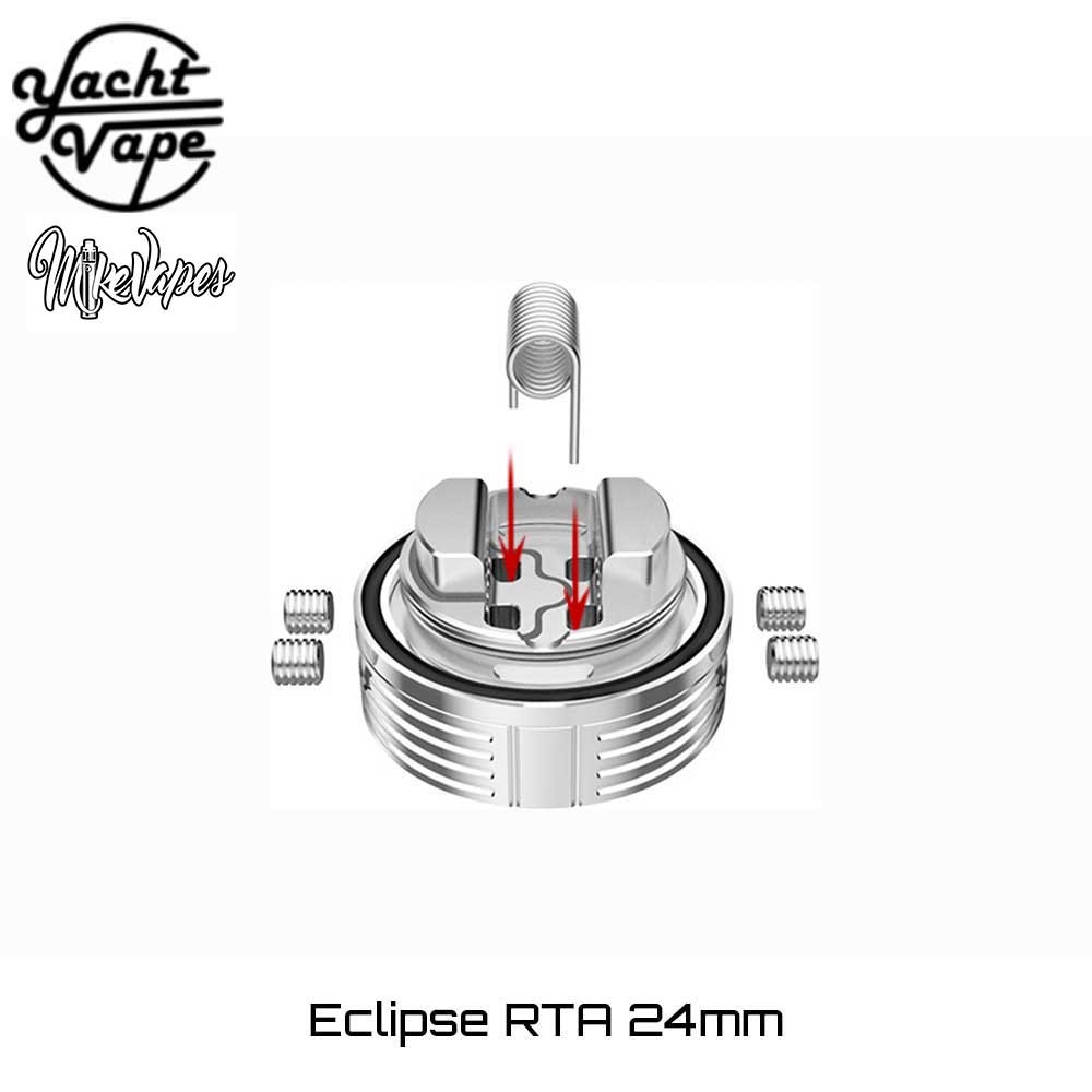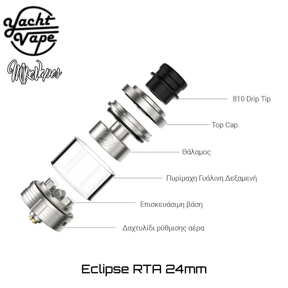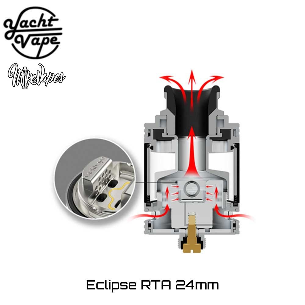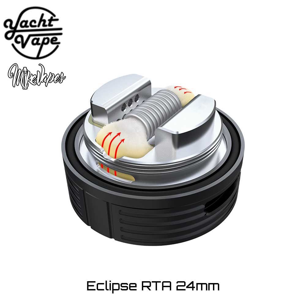Η Yachtvape και ο MikeVapes συνεργάστηκαν και μας παρουσιάζουν έναν εξαίρετο επισκευάσιμο πνευμονικό RTA ατμοποιητή! ο Eclipse 24 RTA δημιουργήθηκε για να φέρει το ποιοτικό, γευστικό Direct-to-Lung άτμισμα στα χέρια του κάθε ατμιστή, αρχάριου ή έμπειρου!